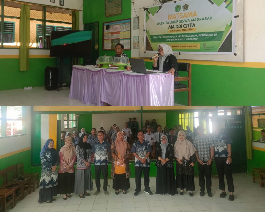 Humas MAS DDI Citta – Pengawas Damping Madrasah Kementerian Agama Kabupaten Soppeng, Dra. Hj. Harnis, M.Pd., hadir menyapa dan memberikan motivasi kepada peserta didik baru pada hari ketiga pelaksanaan Masa Ta’aruf Siswa Madrasah (MATSAMA) di MAS DDI Citta, Selasa (16/07/2025).
